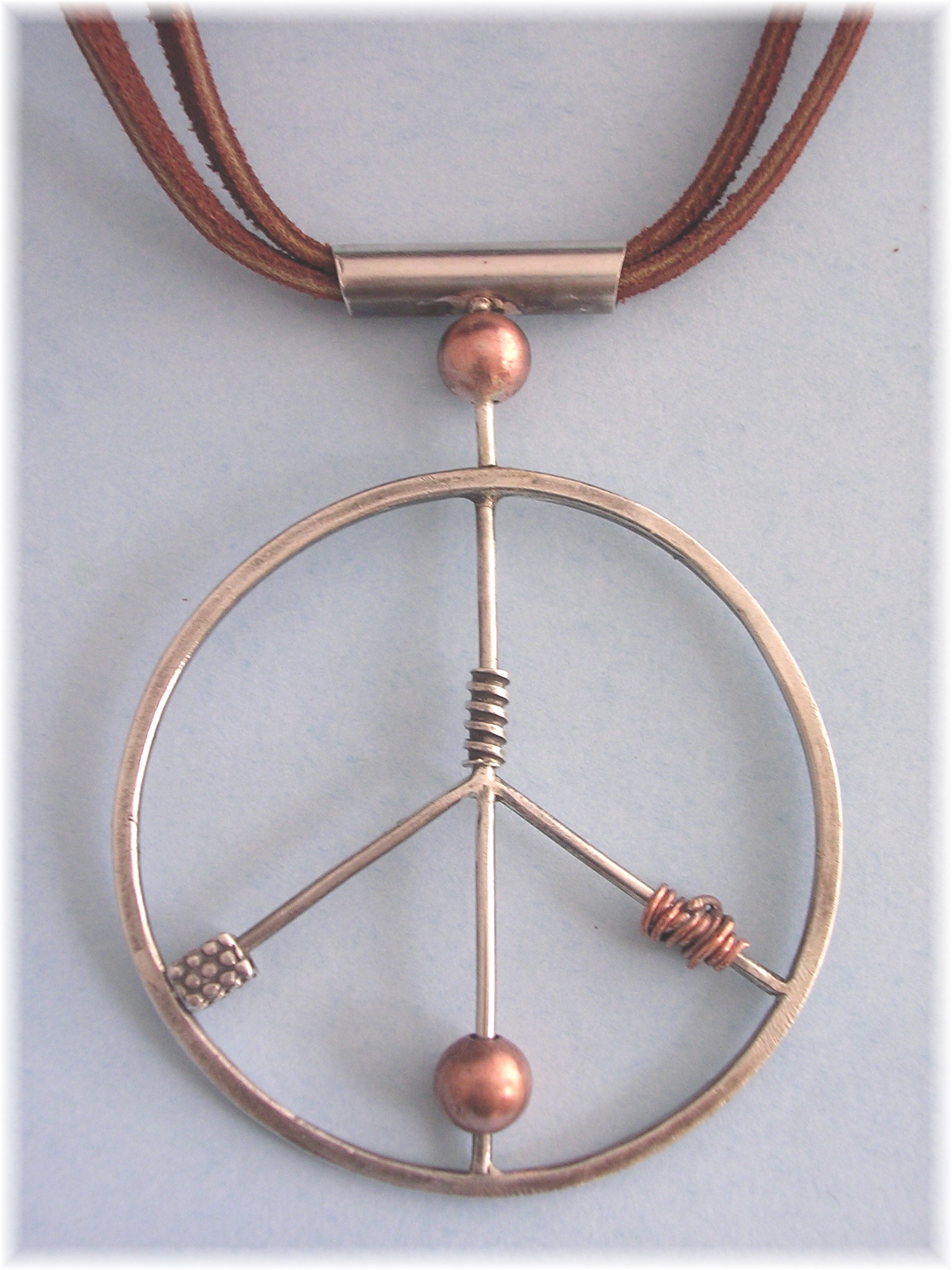 | Playful. Optimistic. Wear this to inspire a peaceful attitude in everyone you meet! Sterling pendant with sterling and copper beads. Hangs on a double brown leather cord with five inch extension and toggle. Pendant measures 3" x 2". $169 |