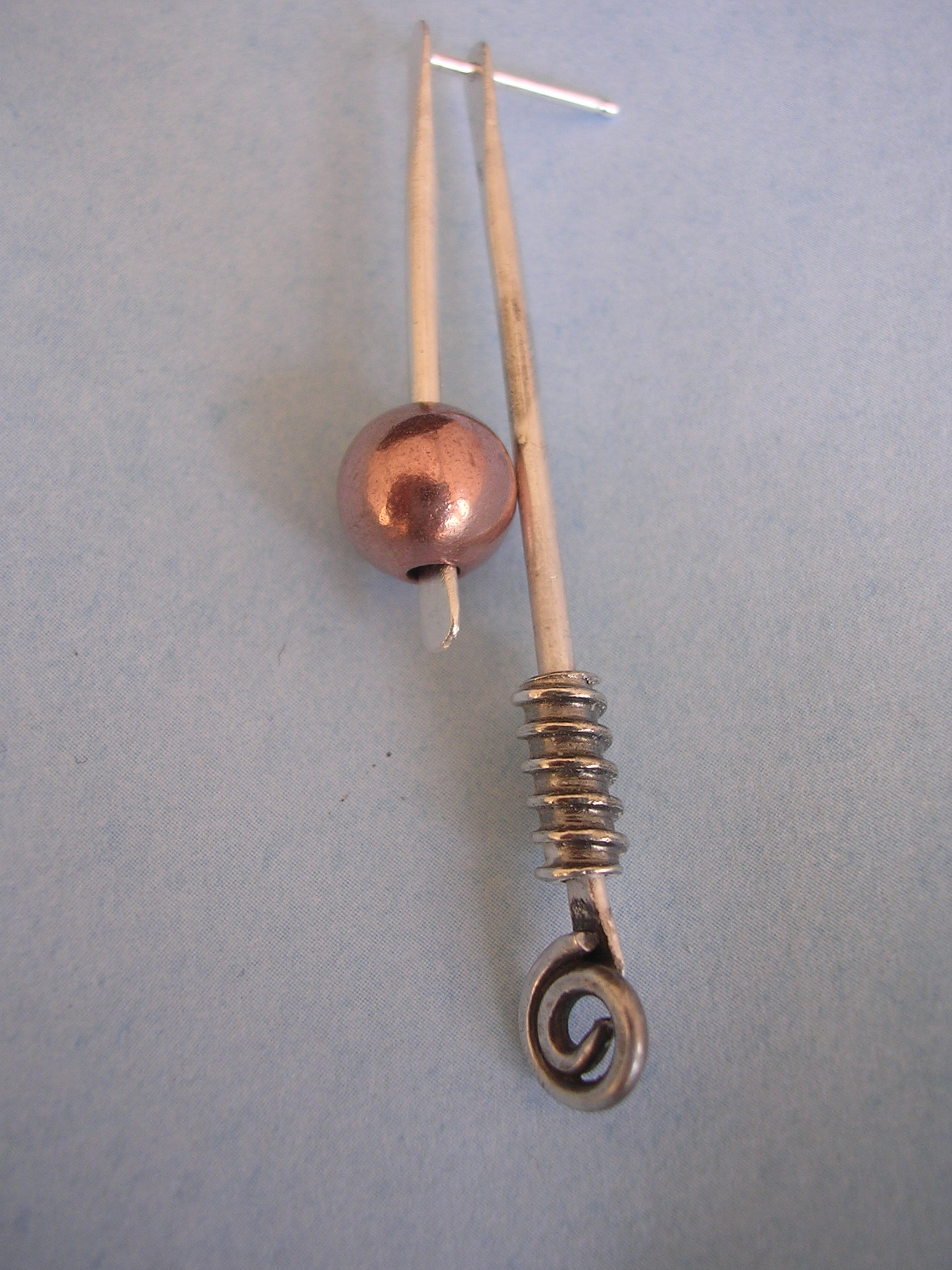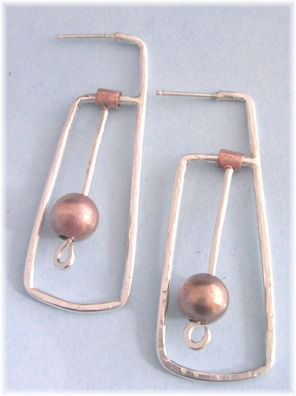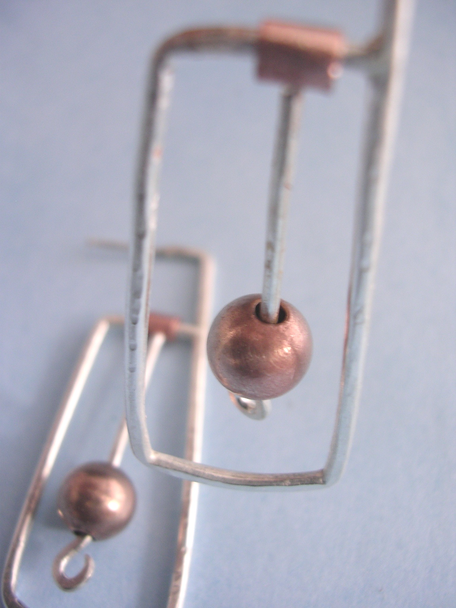 | One of a kind. Copper beads swing freely from these sterling silver geometric earrings. Wear anywhere and everywhere! $75 |