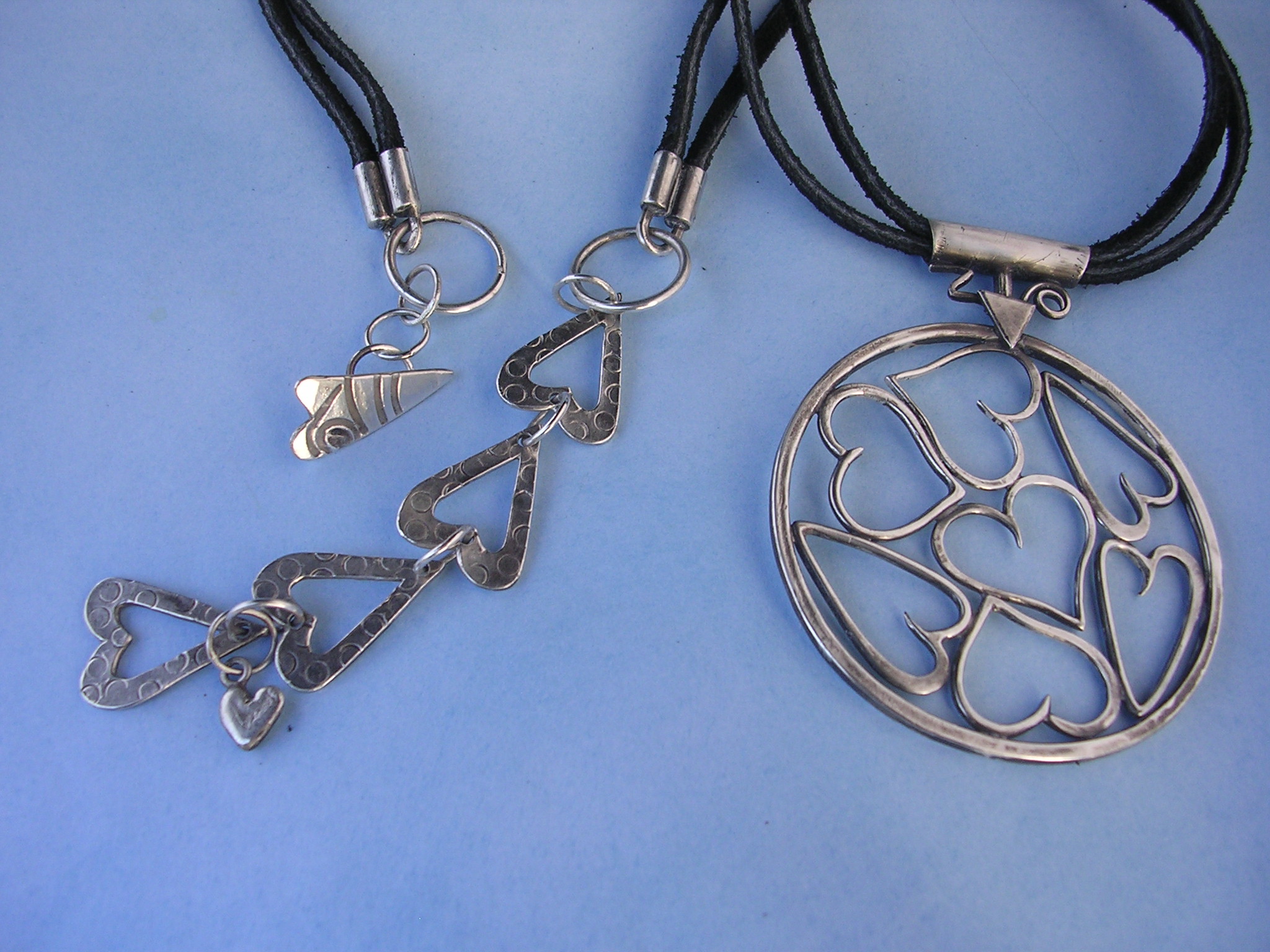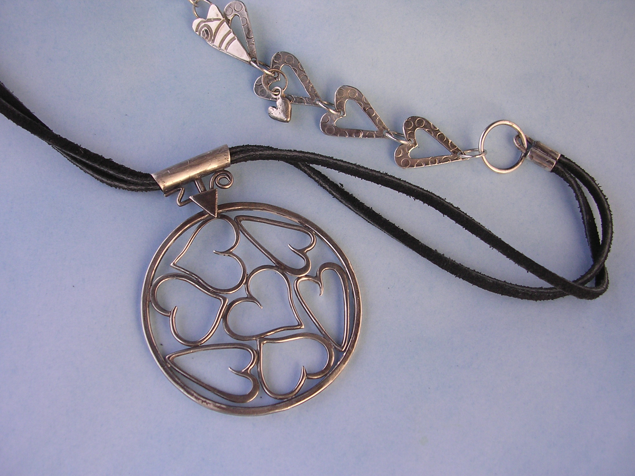 | Significant. Unique. Hangs on a 16" double black leather cord with decorative extension and heart toggle. A small heart drop even hangs from the clasp! Measures 3" x 2" $169 |