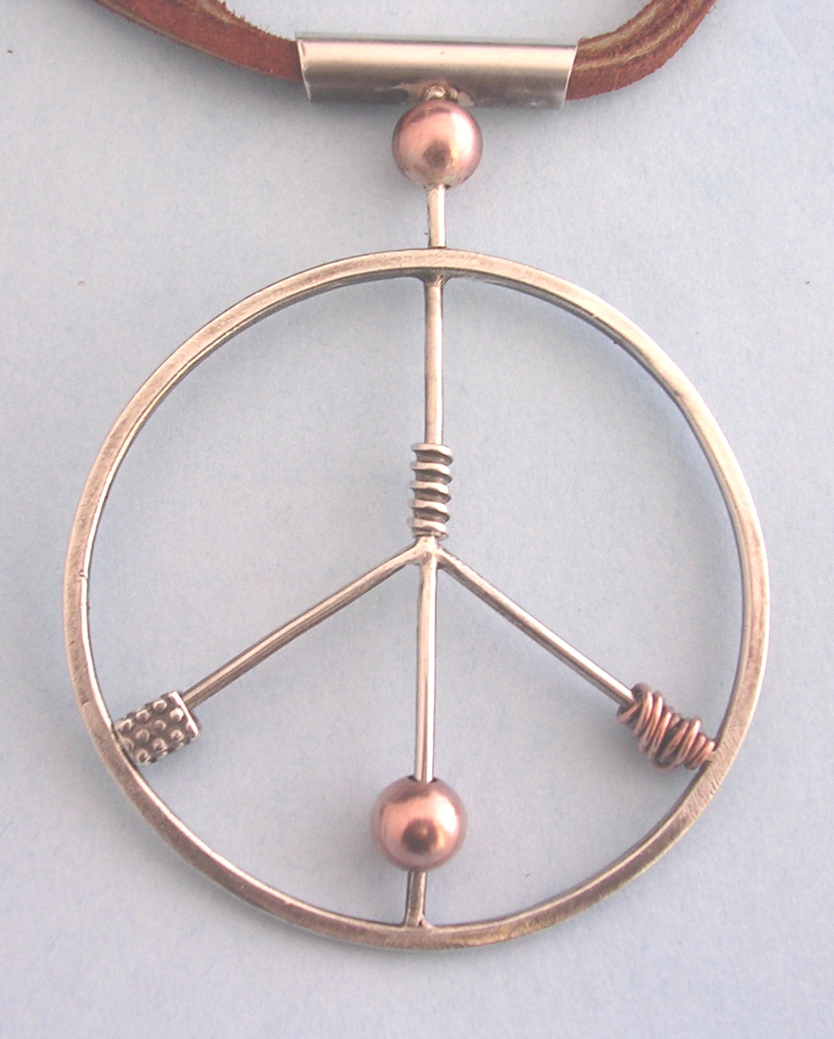 | Playful. Optimistic. Wear this to inspire a peaceful attitude in everyone you meet! Sterling pendant with sterling and copper beads. Hangs on a double brown leather cord with five inch extension and toggle. Pendant measures 3" x 2". $169 |