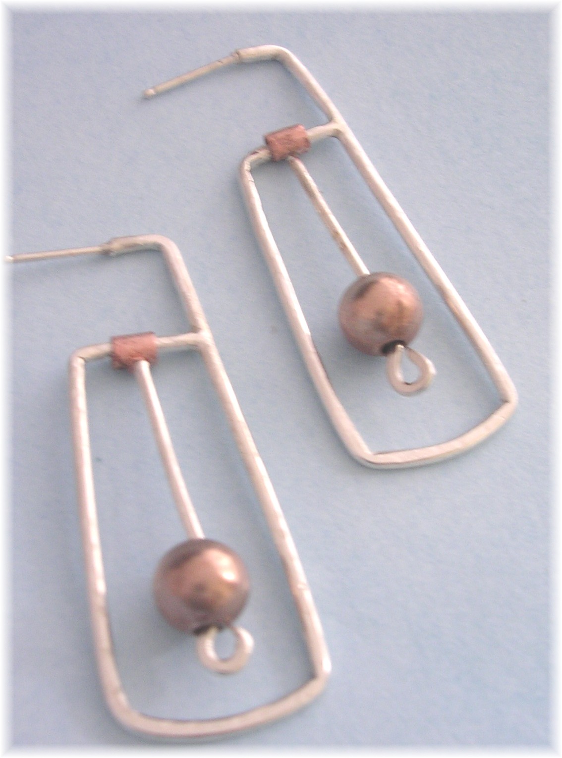 | One of a kind. Copper beads swing freely from these sterling silver geometric earrings. Wear anywhere and everywhere! $75 |